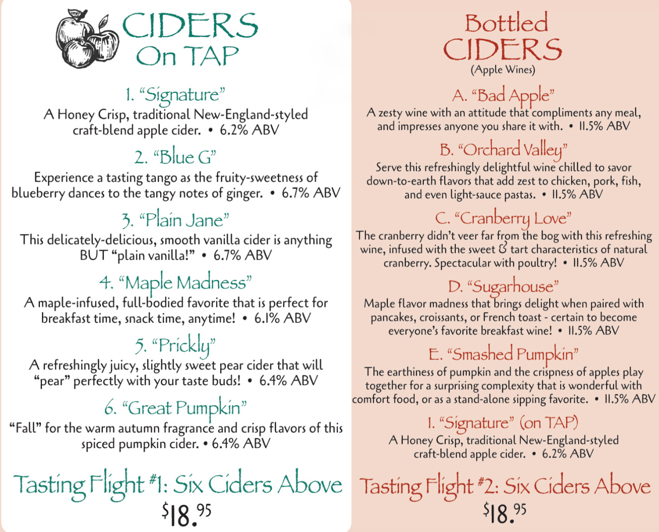 Choose between our Ciders on Tap or our Bottled Cider (Apple Wines)